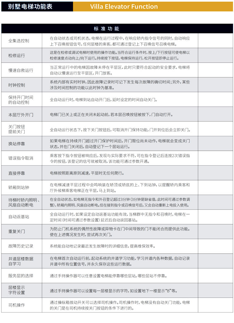 ? ?? 天津市洋郡電梯有限公司.是一家電梯設(shè)計(jì)、銷售、安裝、維保服務(wù)為一體。主營各種電梯產(chǎn)品,包括別墅電梯、觀光電梯、乘客電梯、住宅 安裝便捷 無需獨(dú)立機(jī)房,自帶一體化井道。安裝非常簡便,只需一周左右即可完成,而且可以直接安裝在已經(jīng)完成裝修的地板上而不破壞現(xiàn)有裝修。